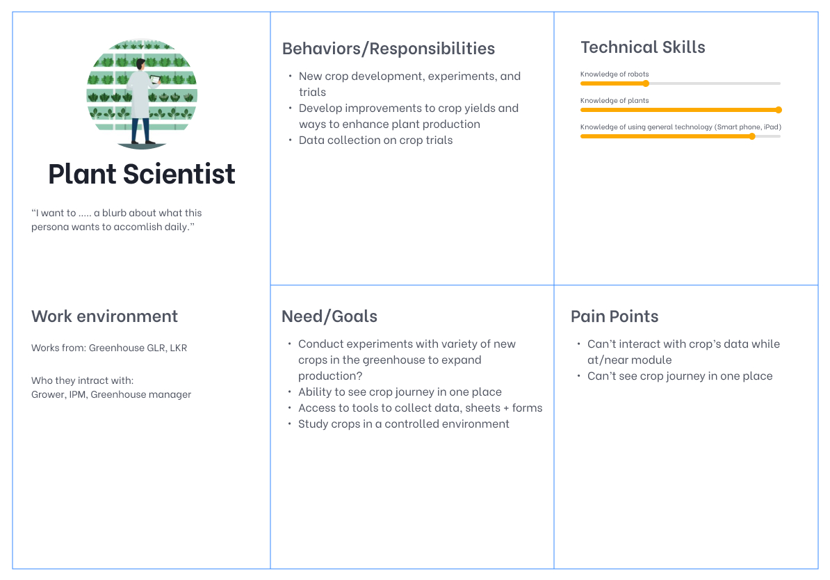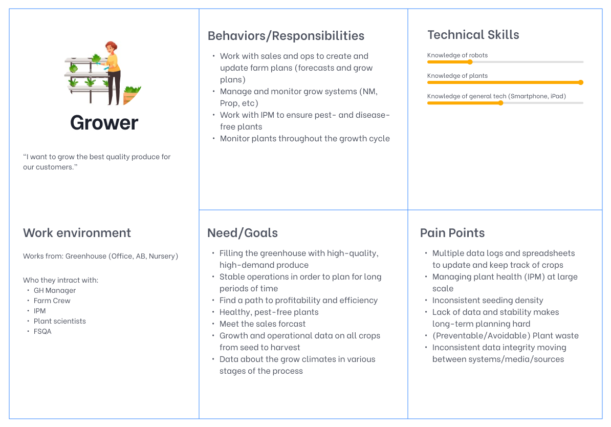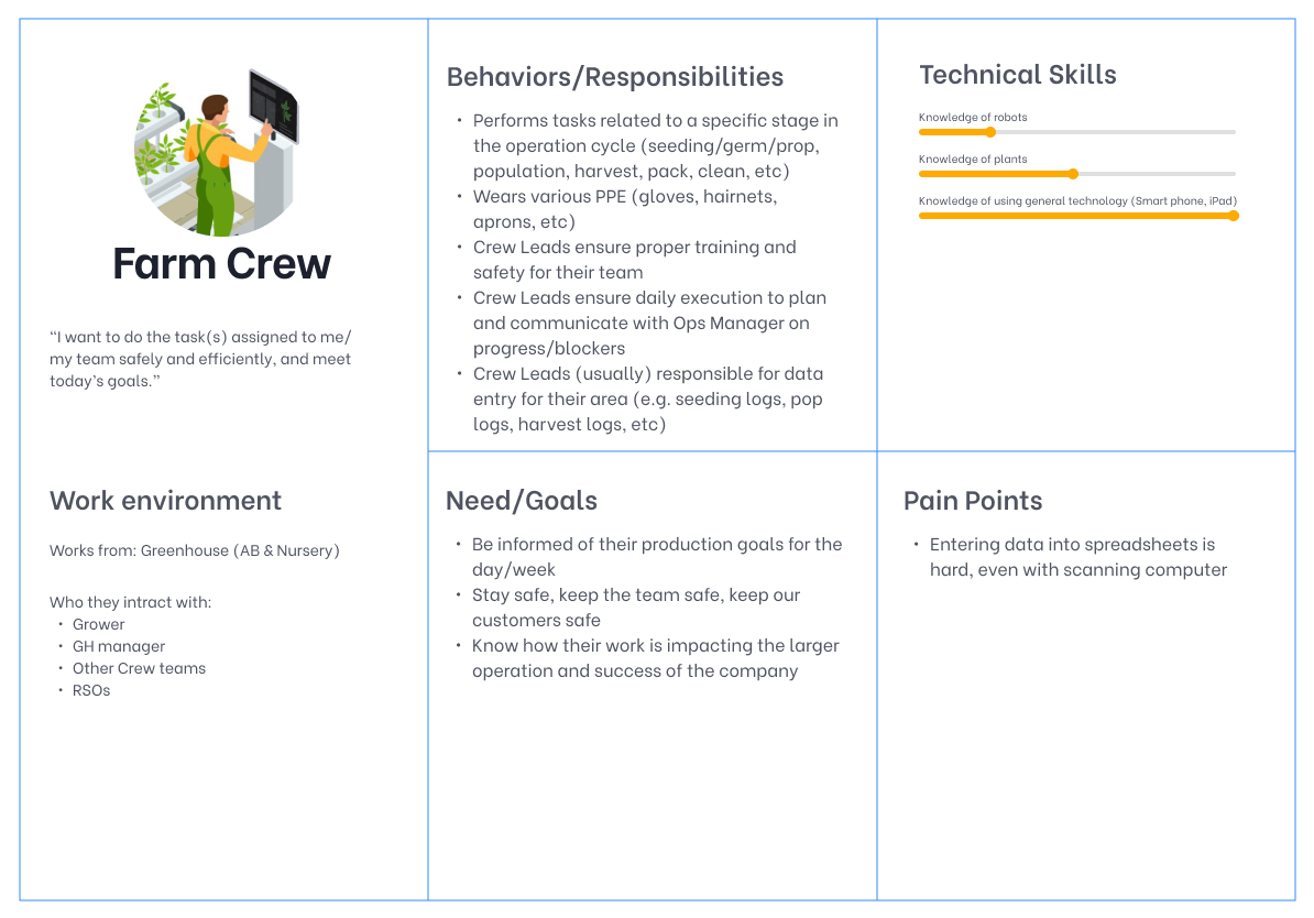 I joined the team at Iron Ox to design and develop internal software applications. Throughout the design process, I gained valuable insights into hydroponic farming, learned about the science of growing plants, and had the opportunity to visit two Iron Ox greenhouses in Gilroy CA, and one in Austin TX.
